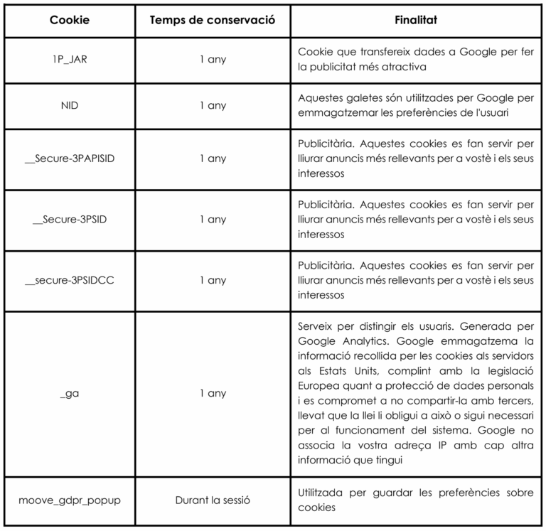 Concretament, Google Analytics és un servei analític web prestat per Google, Inc., una companyia de Delaware amb oficina principal al 1600 Amphitheatre Parkway, Mountain View (Califòrnia), CA 94043, Estats Units (“Google”). Finalment, l’usuari pot consultar aquí el tipus de cookies utilitzades per Google.